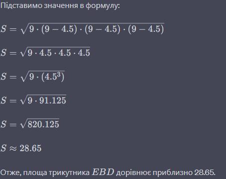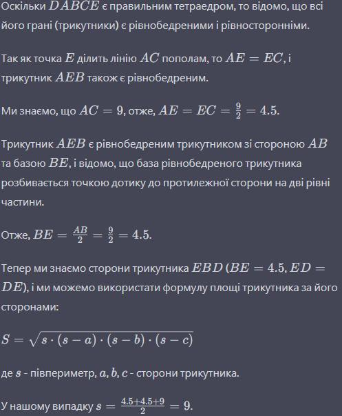 DABCE – правильный тетраэдр. Точка Е делит пополам линию АС. При AC=9 найти площадь треугольника EBD.