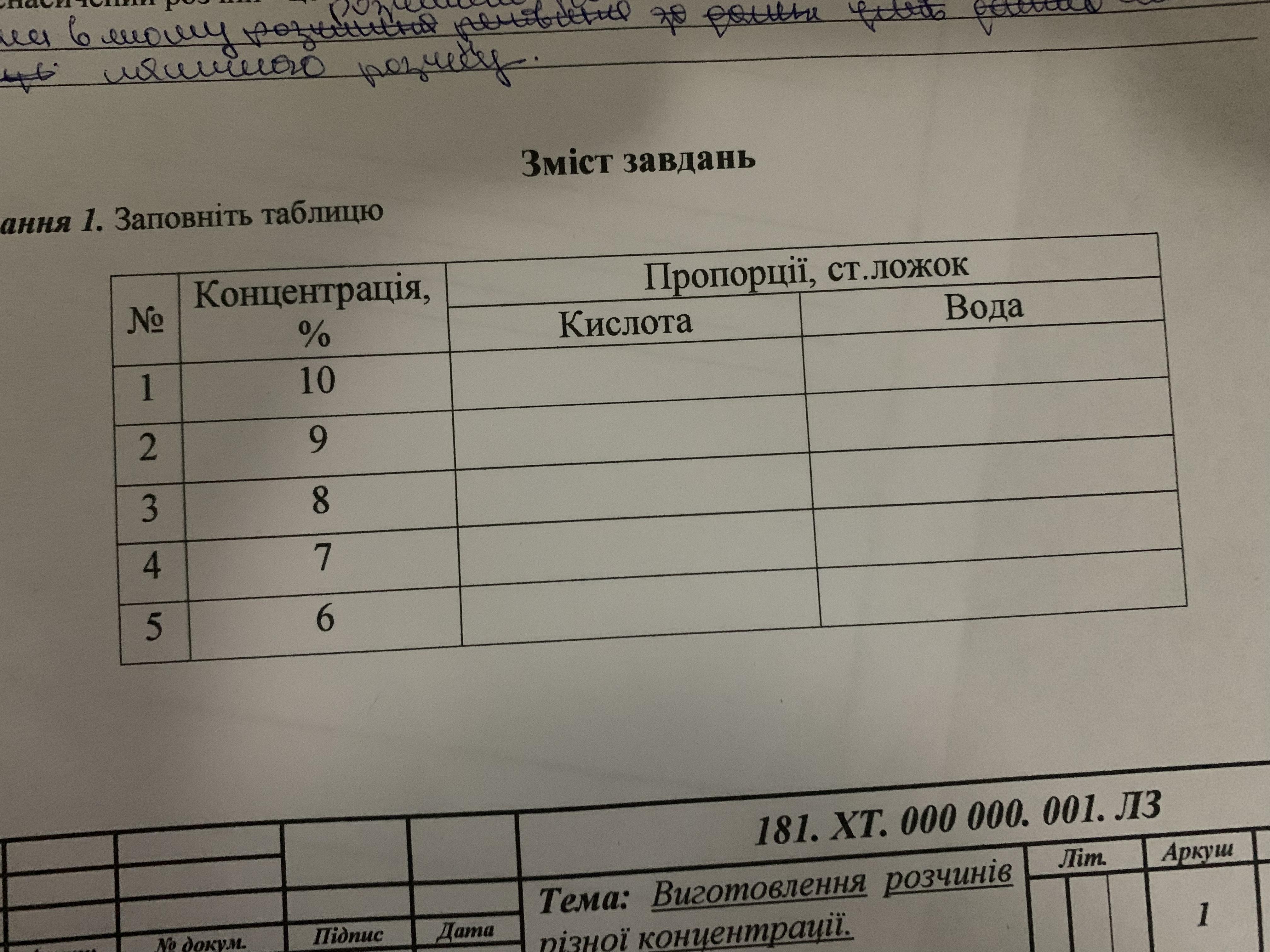 | Концентрація, | Кислота | Пропорції, ст. ложок |