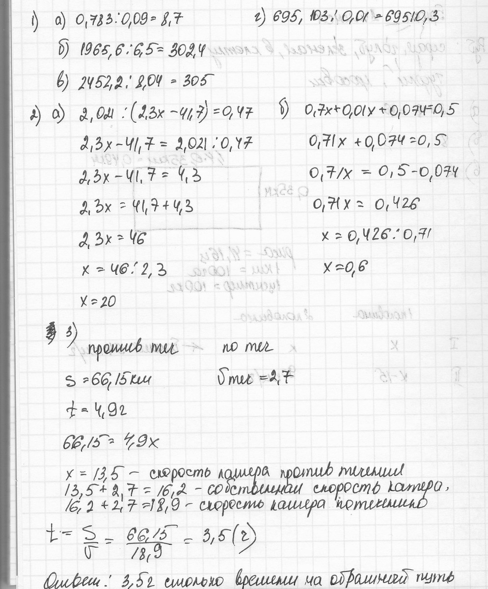 Помогите решить))) №1.а) 0,783 : 0,09 б) 1965,6 : 6,5 в) 2452,2 : 8,04 г) 695,103 : 0,01 №2 а) 2,021 : (2,3x - 41,7) = 0,47 б) 0,7x + 0,01x + 0,074 = 0,5. №3 Катер прошел против течения 66,15 км за 4,9 ч. Сколько времени ему понадобится на обратный путь, если скорость течения равна 2,7 км/ч?
