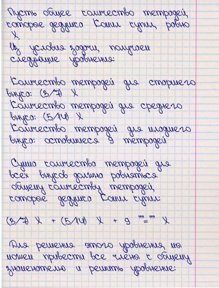 Дедушка Комил купил своим внукам немколько тетрадей . Старшему внуку отдал 3/7 части от общего количества всех тетрадей, среднему внуку - 5/14 части , а оставшиеся 9 тетрадей отдал младшему внуку. Сколько тетрадей купил дедушка Комил?