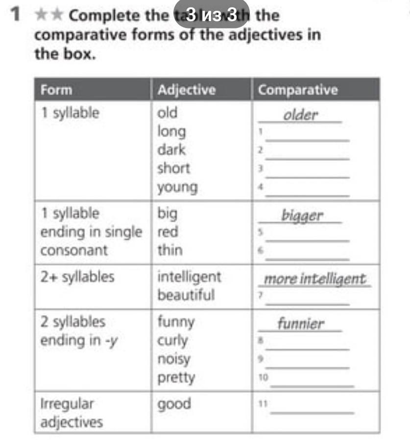 1. old - older, long - longer, dark - darker, short - shorter, young - younger;