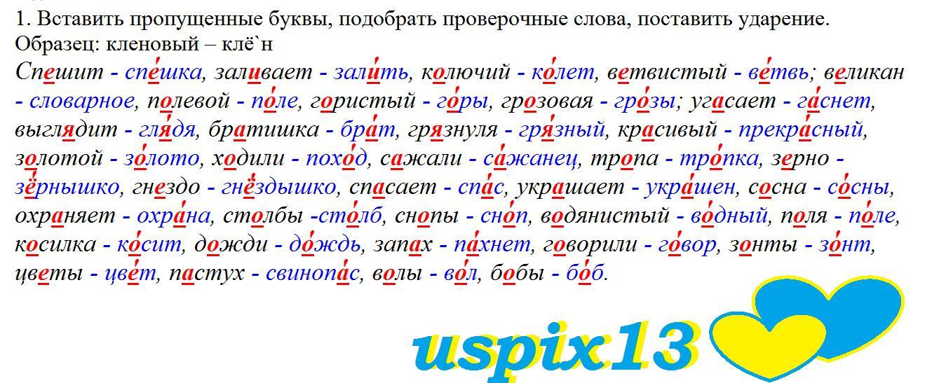 1. Вставить пропущенные буквы, подобрать проверочные слова, поставить ударение. Образец: кленовый – клё`н Сп..шит, зал..вает, к..лючий, в..твистый; в..ликан, п..левой, г.ристый, гр..зовая; уг..сает, выгл..дит, бр..тишка, гр..знуля, кр..сивый, з..лотой, х..дили, с..жали, тр..па, з..рно, гн..здо, сп..сает, укр..шает, с..сна, охр..няет, ст..лбы, сн..пы, в..дянистый, п..ля, к..силка, д..жди, зап..х, г..ворили, з..нты, цв..ты, п..стух, в..лы, б..бы.