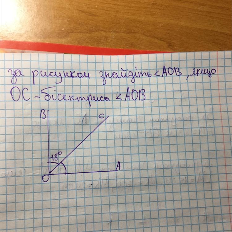 кут аов будет 36° так как бісектриса ділить кут навпіл а якщо відомо одну сторону то інша буде такаж і щоб знайти повністю кут то треба їх додати