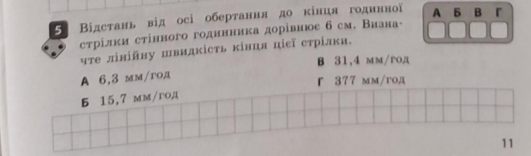 Відстань від осі обертання до кінця годинної стрілки стінного годинника дорівнює 6 см. Визначте лінійну швидкість кінця стрілки