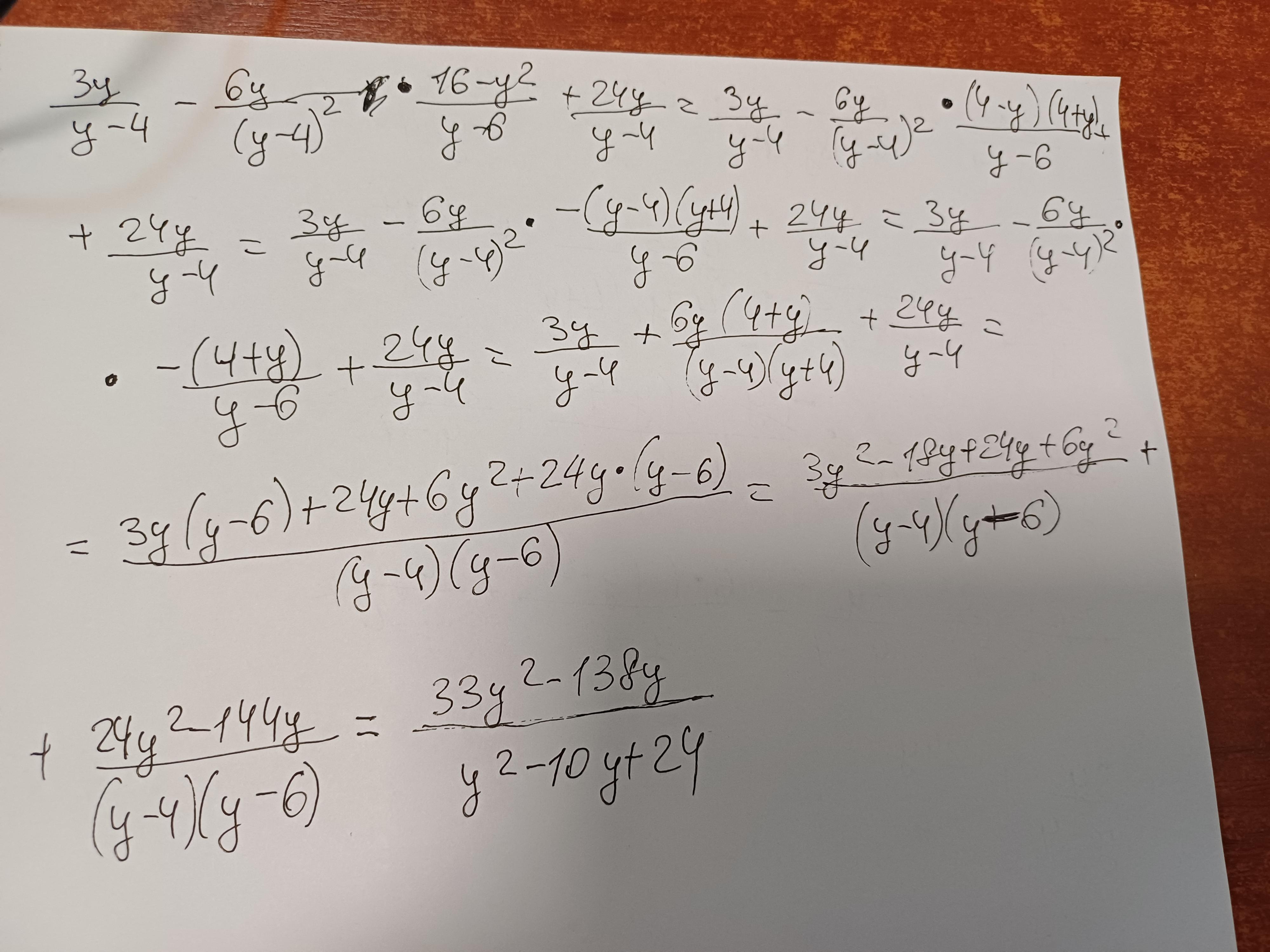 ((3y)/(y - 4) - (6y)/(y ^ 2 - 8y + 16)) / ((y - 6)/(16 - y ^ 2)) + (24y)/(y - 4)