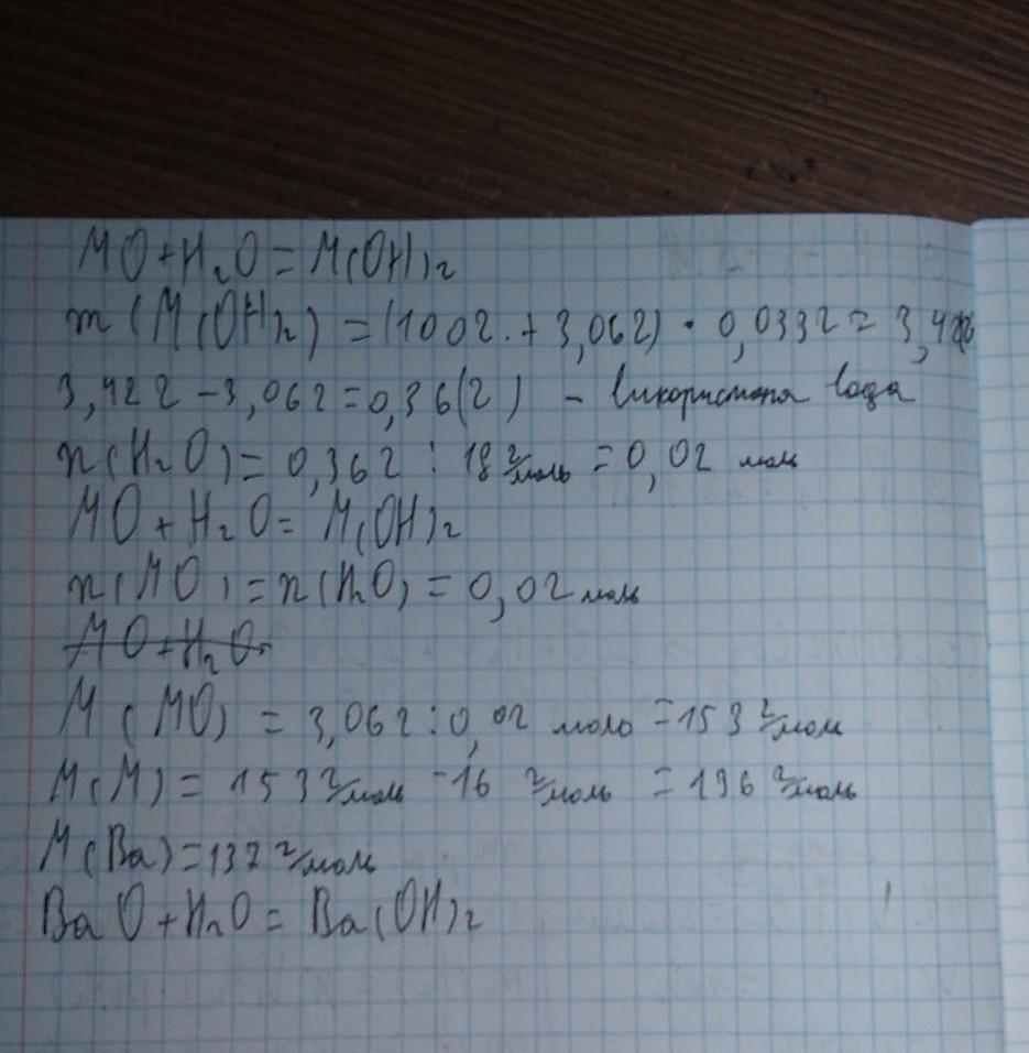 13. Оксид двовалентного металічного елементу масою 3,06 г повністю розчинили в 100 мл води і отримали розчин гідроксиду даного елементу з масовою часткою 3,32%. Визначте формулу вихідного оксиду. Складіть рівняння реакції взаємодії оксиду з водою