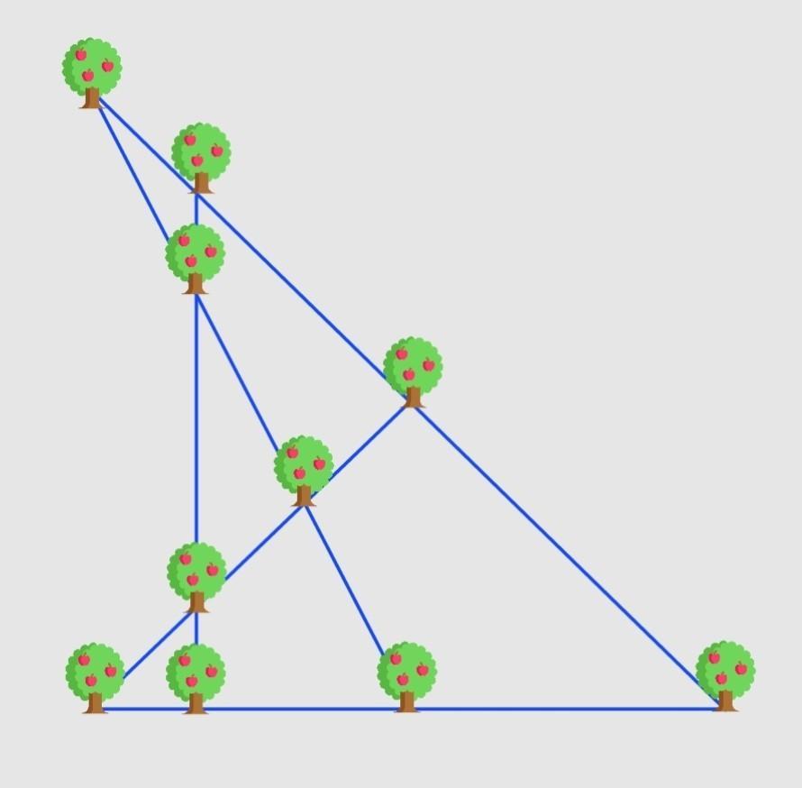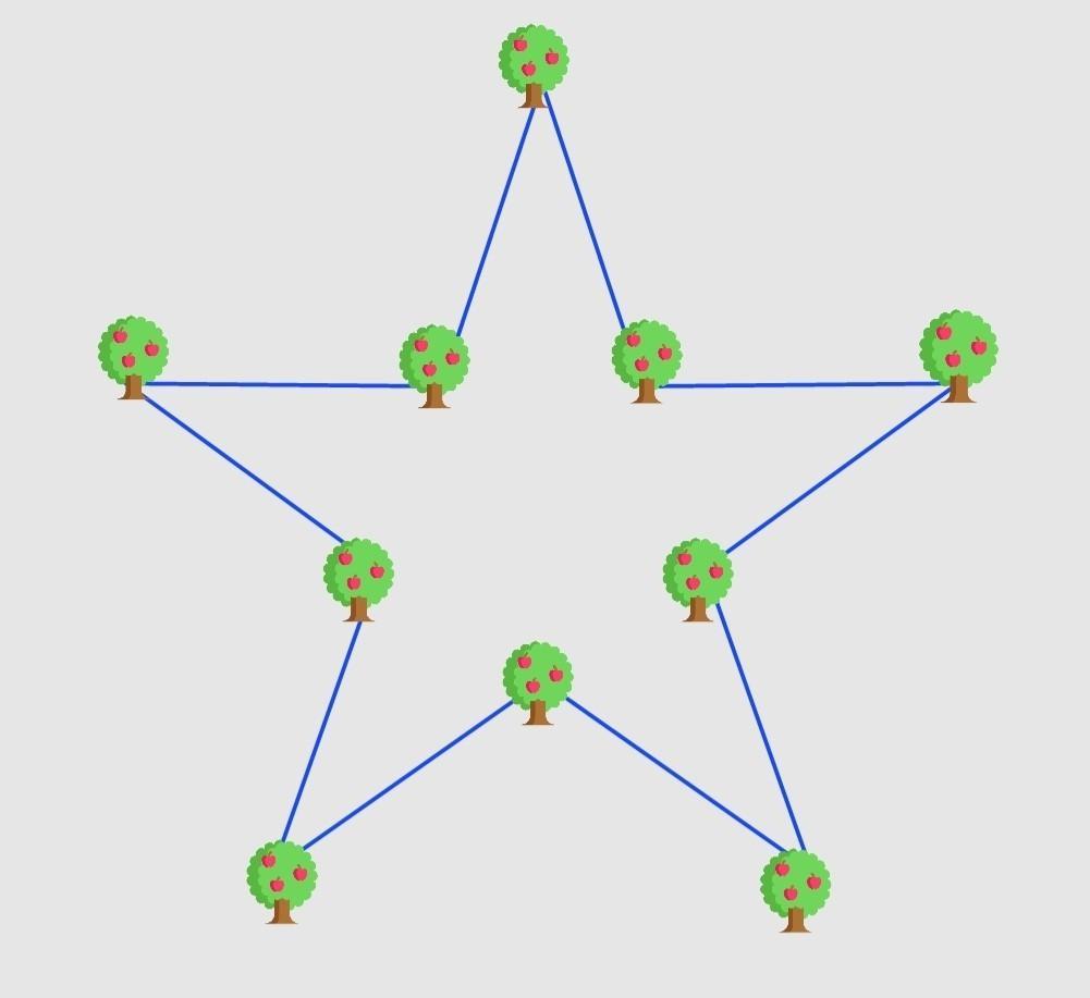 Якщо рахувати лінійно, то у нас нічого не вийде: 5 рядів по 4 яблуні - це 20 яблунь, а у нас їх всього 10.