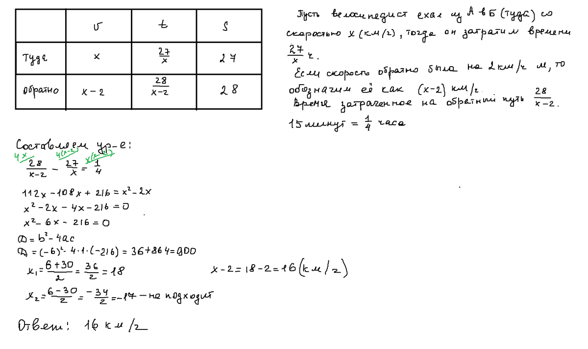 Велосипедист проехал 27км по шоссе из А в Б. Возвращался он по просёлочной дороге длинной 28км со скоростью на 2км/ч меньшей. Обратный путь оказался на 15 минут дольше, чем путь из А в Б. С какой скоростью возвращался велосипедист из Б?