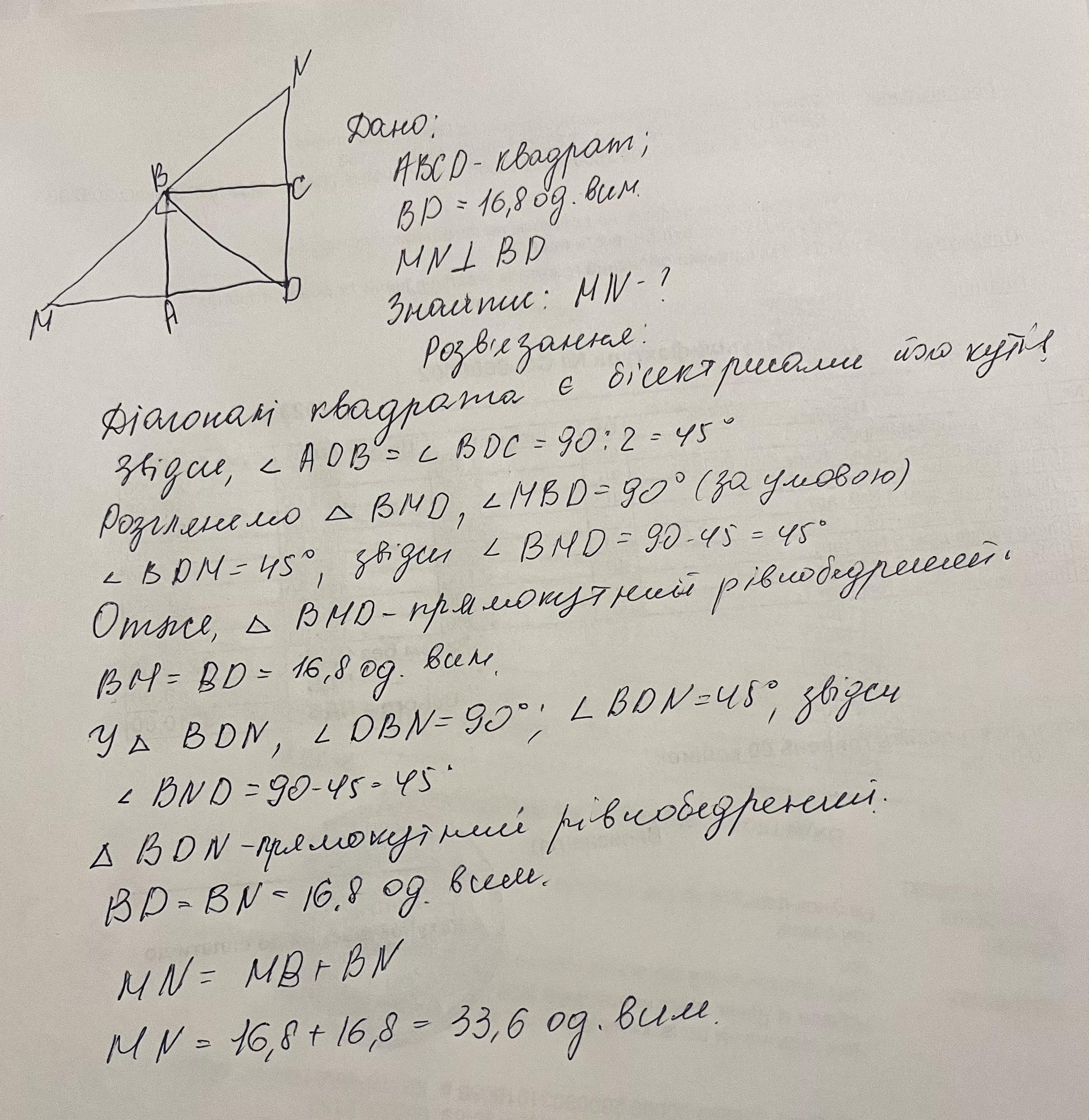 Маємо квадрат ABCD. Через кінцеву точку B діагоналі BD, що дорівнює 16,8 од. вим., проведено пряму перпендикулярно до діагоналі BD.Проведена пряма перетинає прямі DA та DC в точках M і N відповідно.