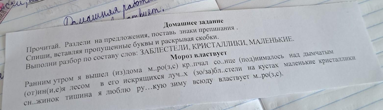 cau, nat д endins Домашняя работа. imbuem.. виет Домашнее задание Прочитай. Раздели на предложения, поставь знаки препинания. Спиши, вставляя пропущенные буквы и раскрывая скобки. Выполни разбор по составу слов: ЗАБЛЕСТЕЛИ, КРИСТАЛЛИКИ, МАЛЕНЬКИЕ. Мороз властвует Ранним утром я вышел (из)дома м..ро(3,с) кр..пчал со..нце (под)нималось над дымчатым (от)ин(и,е)я лесом в его искрящихся луч..x (30/за)бл..стели на кустах маленькие кристаллики сн..жинок тишина я люблю ру...кую зиму всюду властвует м..ро(3,с).