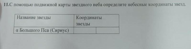 11.С помощью подвижной карты звездного неба определите небесные координаты звезд. Координаты звезды Название звезды а Большого Пса (Сириус)