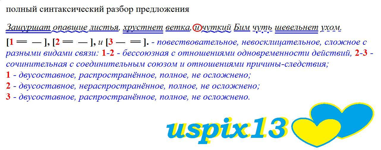 Предложение: "Зашуршат опавшие листья, хрустнет ветка, и чуткий Бим чуть шевельнет."