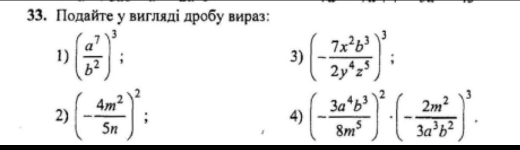 33. Подайте у вигляді дробу вираз: 1) h2 4m² 2) (*): 5n 7x2b3 2y²z5 4-5 3 3) « ( ) ( ) - 8 Заьз 8m5 2m² Зазь2