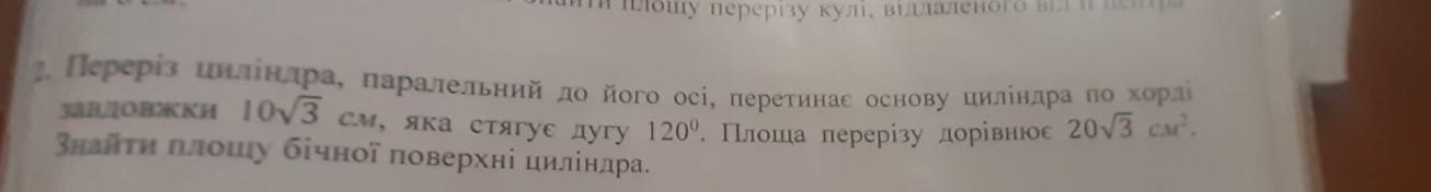Переріз циліндра, паралельний до його осі, перетинає основу циліндра завдовжки 10sqrt(3) см, яка стягує дугу 120 ^ 0 Площа перерізу дорівнює . 20sqrt(3) * c * u ^ 2 Знайти площу бічної поверхні циліндра. 100