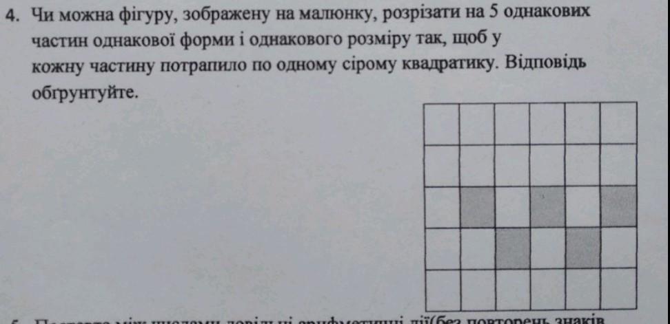 4. Чи можна фігуру, зображену на малюнку, розрізати на 5 однакових частин однакової форми і однакового розміру так, щоб у кожну частину потрапило по одному сірому квадратику. Відповідь обгрунтуйте.