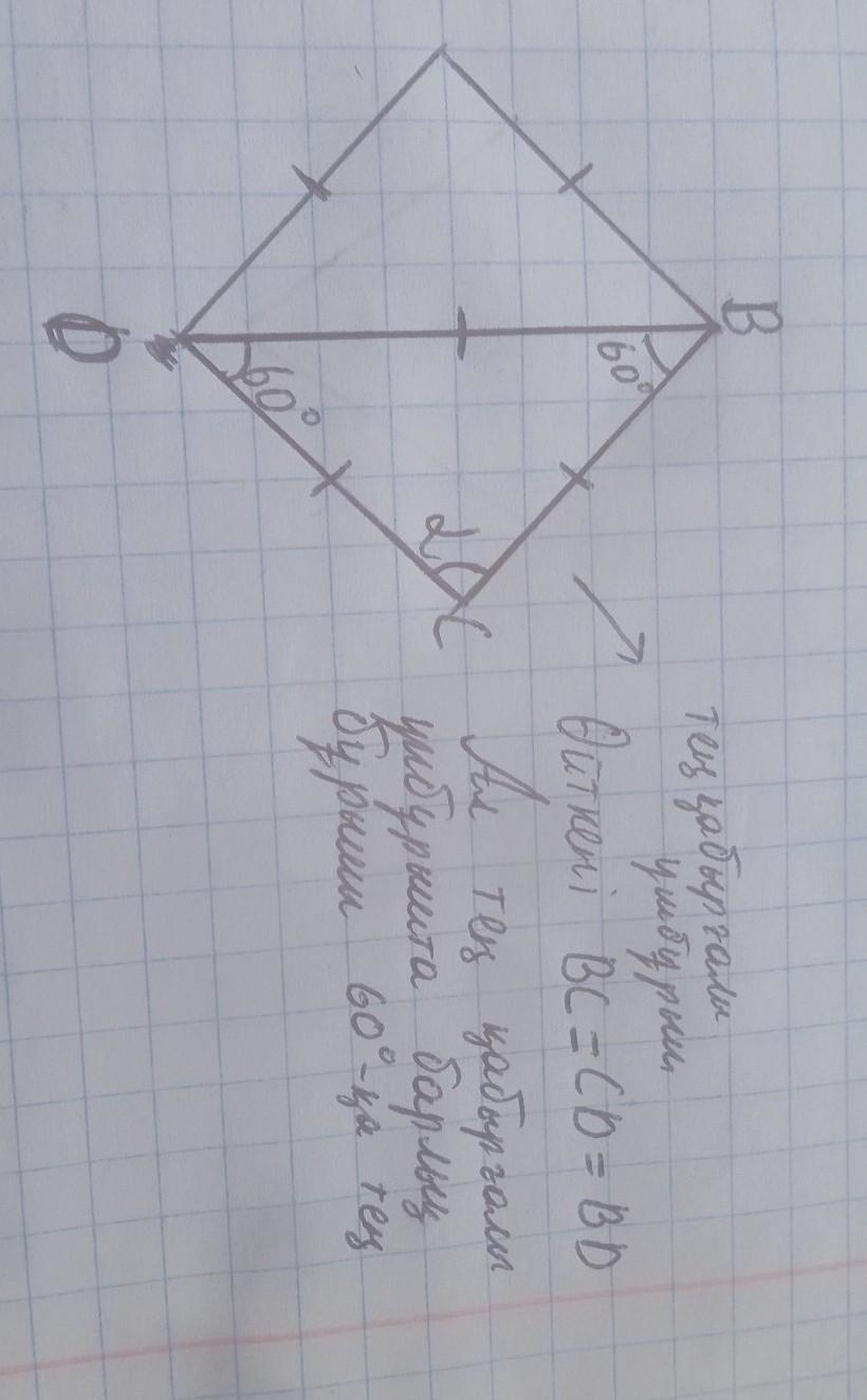 BC және CD векторларынынң арасындағы бұрыш 60⁰ болуының себебі BCD үшбұрышы тенқабырғалы, ал теңқабырғалы үшбұрыштардың әр бұрышы 60 градусқа тең. Ал ол үшбұрыштың теңқабырғалы болғаңдығы BD диагоналі, яғни ол үшбұрыштң табаны, ромбтың қабырғалары, яғни үшбұрыштың да қабырғаларымен тең.