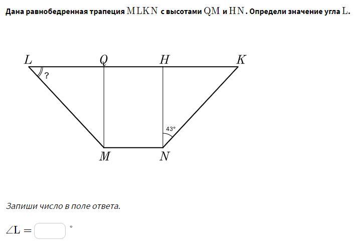 Дана равнобедренная трапеция MLKN с высотами QM и HN. Определите значение угла L.