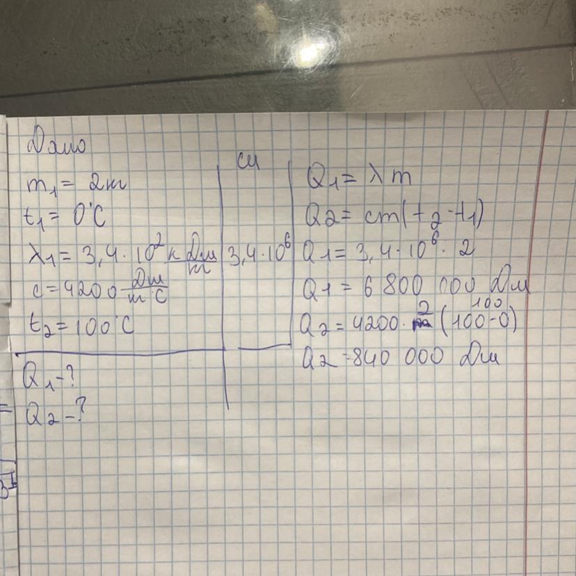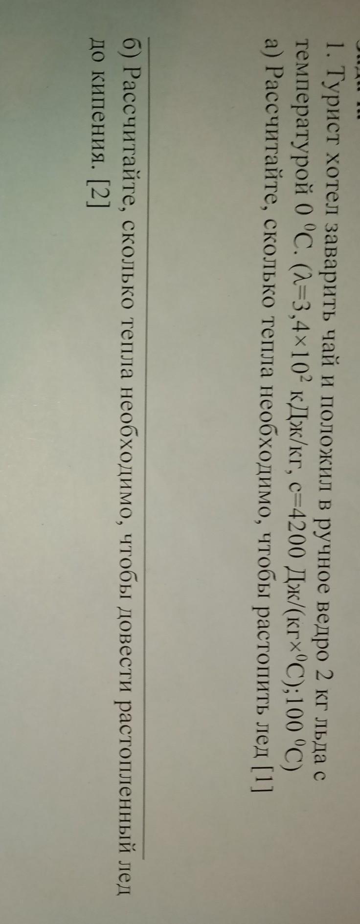 1. Турист хотел заварить чай и положил в ручное ведро 2 кг льда с температурой 0 °C. (2=3,4×10² кДж/кг, с=4200 Дж/(кг*°C);100 °C) а) Рассчитайте, сколько тепла необходимо, чтобы растопить лед