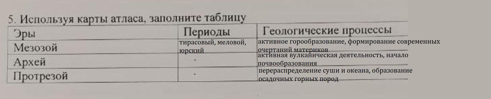 - Используя карты атласа, мы заполнили таблицу.Эры: Мезозой, Архей, Протерозой.