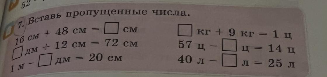 16см+48см=64см. 60дм+12см=72дм. 1м-8дм=2см. 91кг+9кг=1ц 57ц-40ц=14ц 40л-15л=25л