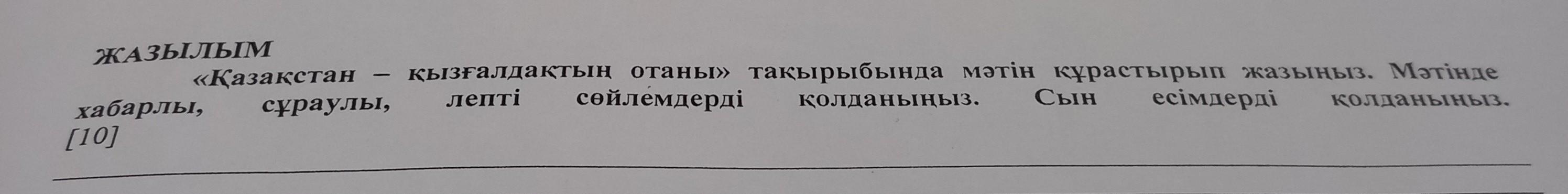 Қазақстан менің ен қызғалдақ отаным. Оның негізінде ауылда және округке қарасты жерде орналасқан көл мен өзен. Ол жерде тек қазақтар тұрат. Бірақта басқа жерлерден орыс тағы әртүрлі адамдар келет. Ал мен қазақпын мен осы Қазақстанда тұрам. Қазақстан-қызғалдық отаным!