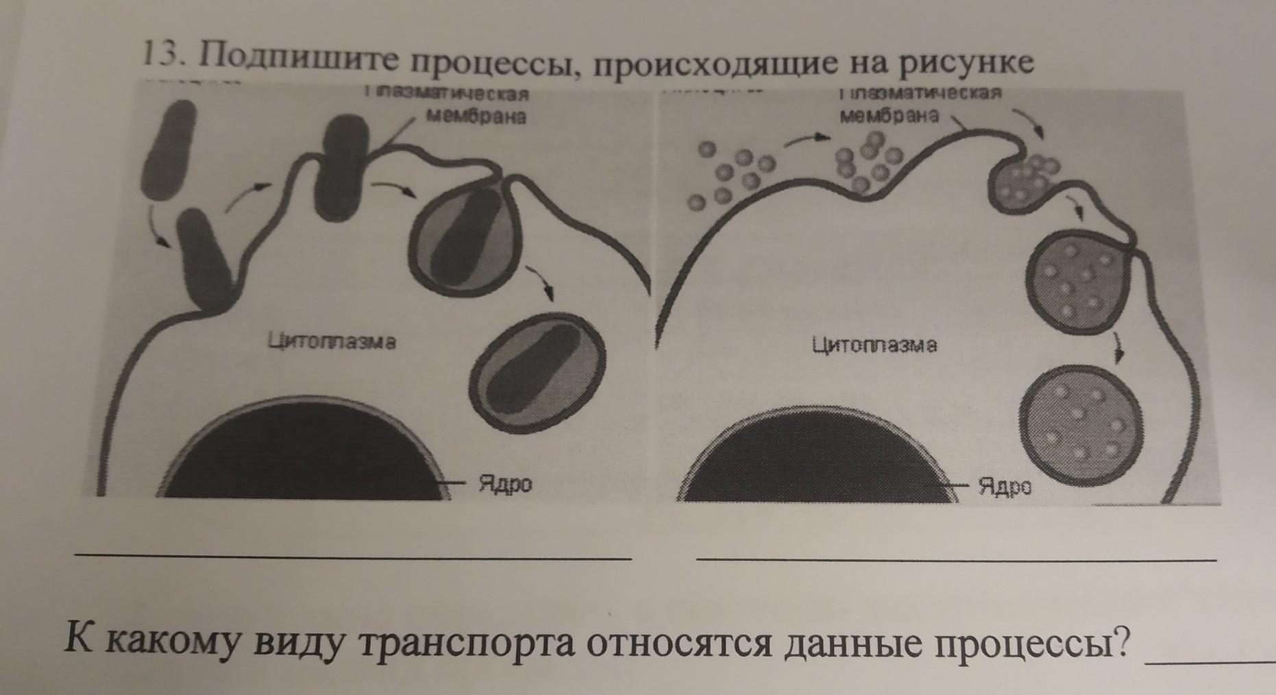 13. Подпишите процессы, происходящие на рисунке плазматическая мембрана 1 лазматическая мембрана Цитоплазма Ядро Цитомазиа Ядро К какому виду транспорта относятся данные процессы?