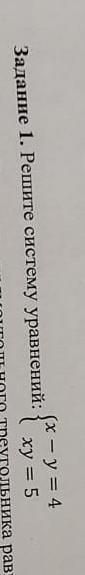 Задание 1. Решите систему уравнений: (x-y=4 xy = 5 Задание 2. Площадь прямоугольного треугольника р тре