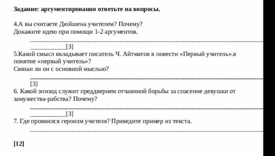 5.Какой смысл вкладывает писатель Ч. Айтматов в повести «Первый учитель».в понятие «первый учитель»? Связан ли он с основной мыслью? [3] 6. Какой эпизод служит преддверием отчаянной борьбы за спасение девушки от замужества-рабства? Почему? [3]