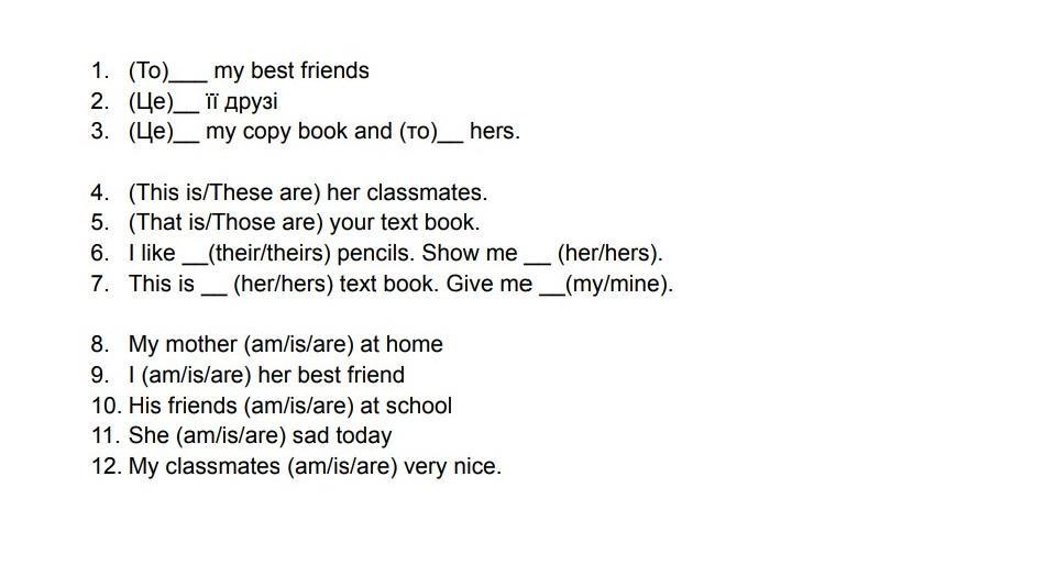 Діти, готуємось до самостійної роботи. Потрібно повторити: Вказівні займенники (this is/these are; that is/those are), Присвійні займенники (Прилягаючі і Абсолютні) і Допоміжне дієслово "to be" (am/is are) Home work (допоможе вам при виконанні тесту) дивіться у прикріпленому файлі.