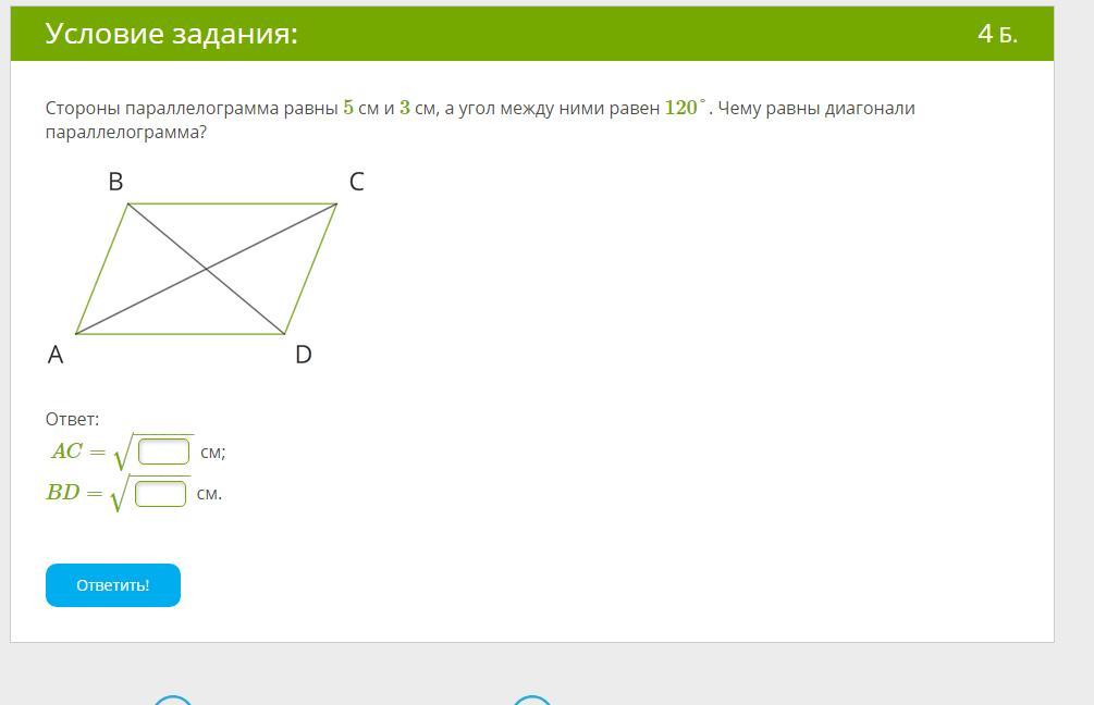 Стороны параллелограмма равны 5см и 3см, а угол между ними равен 120 градусов. Чему равны диагонали параллелограмма?