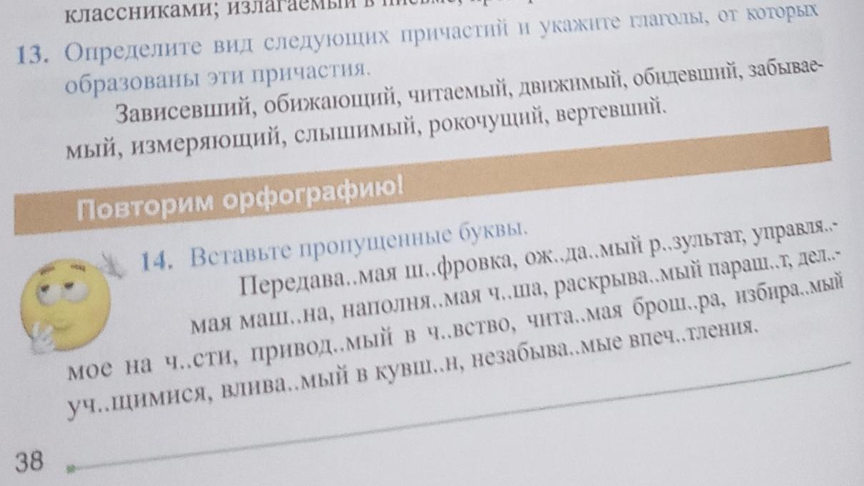 14) передаваемая шифровка, ожидаемый результат,управляемая машина, наполняемая чаша,раскрываемый парашют, делимое на части,приводимый в чувство,читаемая брошюра, избираемый учащимися,вливаемый в кувшин, незабываемые впечатления.
