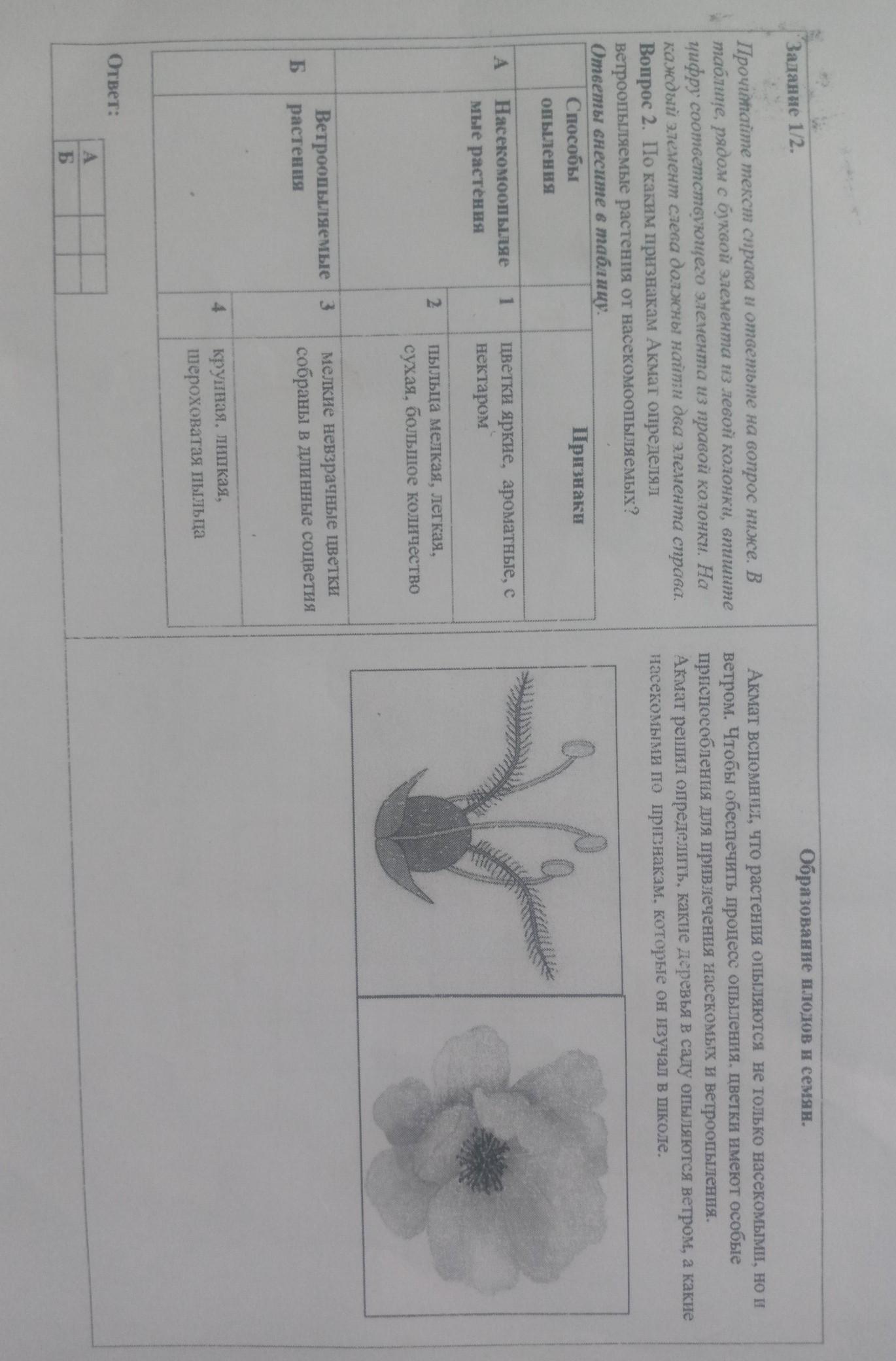 Задание 1/2. Прочитайте текст справа и ответьте на вопрос ниже. В таблице, рядом с буквой элемента из левой колонки, впишите цифру соответствующего элемента из правой колонки. На каждый элемент слева должны найти два элемента справа. Вопрос 2. По каким признакам Акмат определял ветроопыляемые растения от насекомоопыляемых? Ответы снесите в таблицу. A Б Способы опыления Насекомоопыляе мые растения Ветроопыляемые 3 растения Ответ: 2 A Б Признаки цветки яркие, ароматные, с нектаром пыльца мелкая, легкая, сухая, большое количество мелкие невзрачные цветки собраны в длинные соцветия крупная, липкая, шероховатая пыльца Образование плодов и семян. Акмат вспомнил, что растения опыляются не только насекомыми, но и ветром. Чтобы обеспечить процесс опыления, цветки имеют особые приспособления для привлечения насекомых и ветроопыления. Акмат решил определить, какие деревья в саду опляются ветром, а какие насекомыми по признакам, которые он изучал в школе.