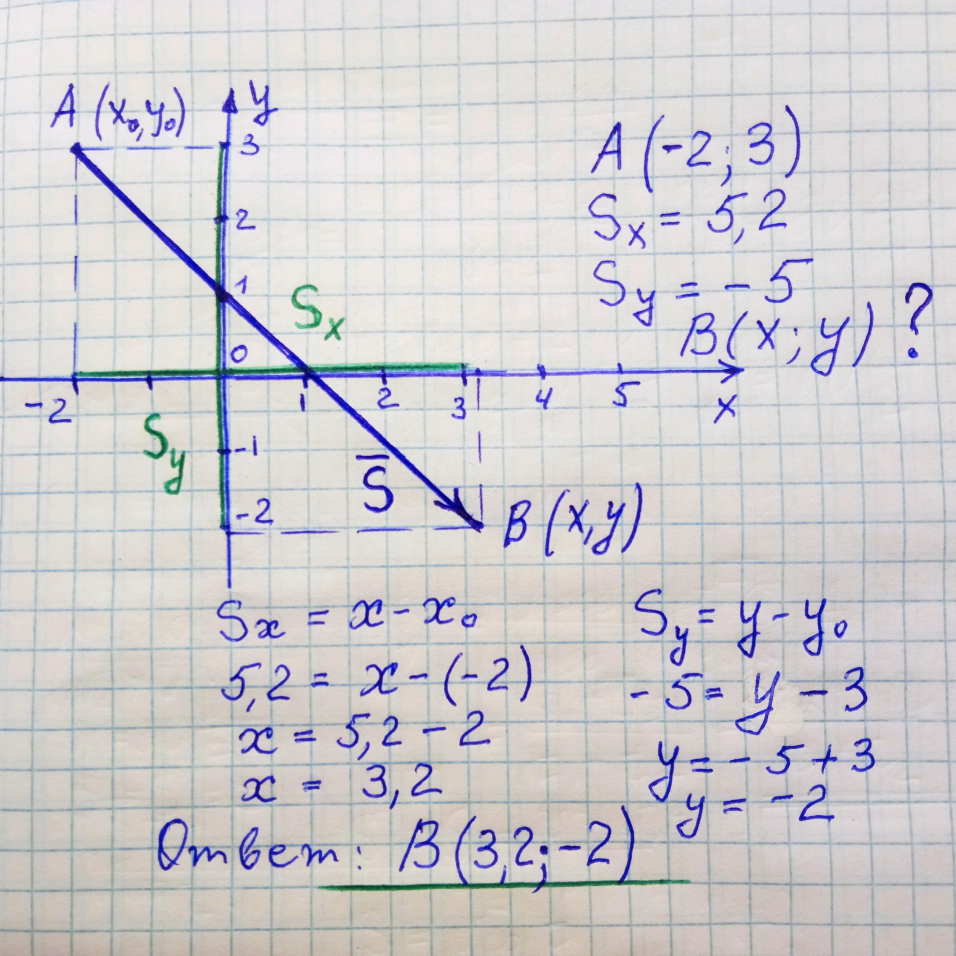 9. Из начальной точки с координатами х0 = -2 м и у0 =3 м тело прошло некоторый путь, так что проекция вектора перемещения на ось х оказалась равной 5,2 м, а на ось у -5 м. Найдите координаты конечного положения тела. Начертите вектор перемещения.