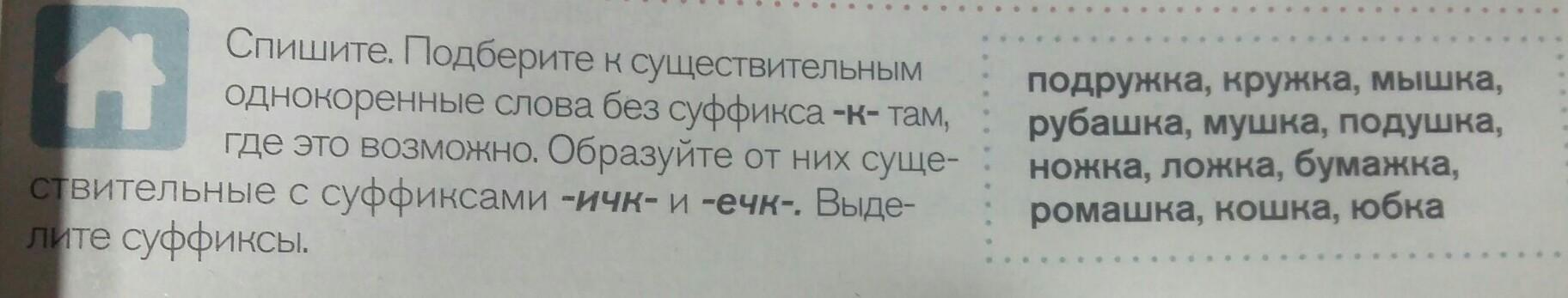 Спишите. Подберите к существительным однокоренные слова без суффикса -к- там, где это возможно. Образыйте от них существительные с суффиксами -ечк- и -ичк-. Выделите суффиксы.