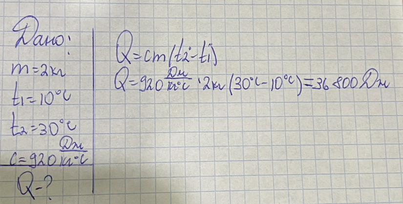 Яка кількість теплоти потрібна для нагрівання 2 кг алюмінію від 10°С до 30°С? Питома теплоємність алюмінію 920дж/кг•°С