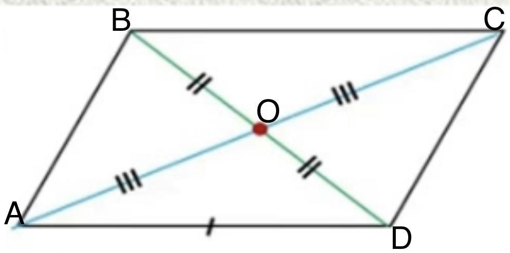 Діагоналі паралелограма точкою перетину діляться навпіл: