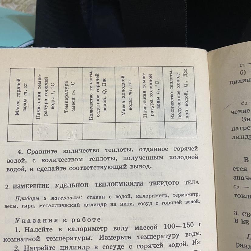 На первом этапе измерений заполняется информация о температуре горячей и холодной воды, которая была налита в калориметр. Необходимо измерить и записать обе температуры.