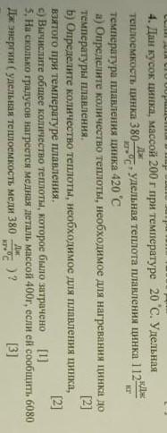 Дж 4. Дан кусок цинка, массой 200ш г при температуре 20 С. Удельная теплоемкость цинка 380- 0 удельная теплота плавления цинка 112 дж температура плавления цинка 420 °C 3 кг а) Определите количество теплоты, необходимое для нагревания цинка до температуры плавления. [2] b) Определите количество теплоты, необходимое для плавления цинка, взятого при температуре плавления. [2] с) Вычислите общее количество теплоты, которое было затрачено [1] 5. На сколько градусов нагреется медная деталь массой 400г, если ей сообщить 6080 [3] Ли Дж энергии ( удельная теплоемкость меди 380 ос )? Всего: [25]