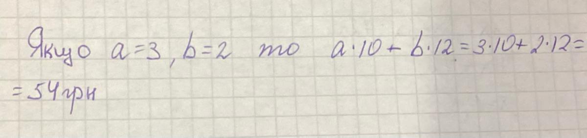 3 * 10 + 2 * 12 = 30 + 24 = 54