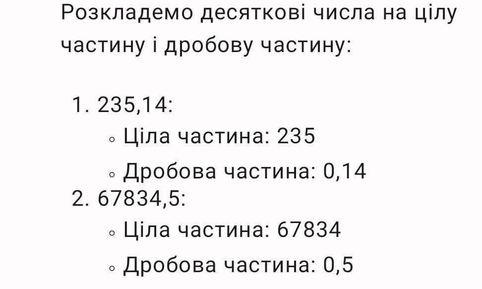 Розкладемо десяткові числа на цілу частину і дробову частину: