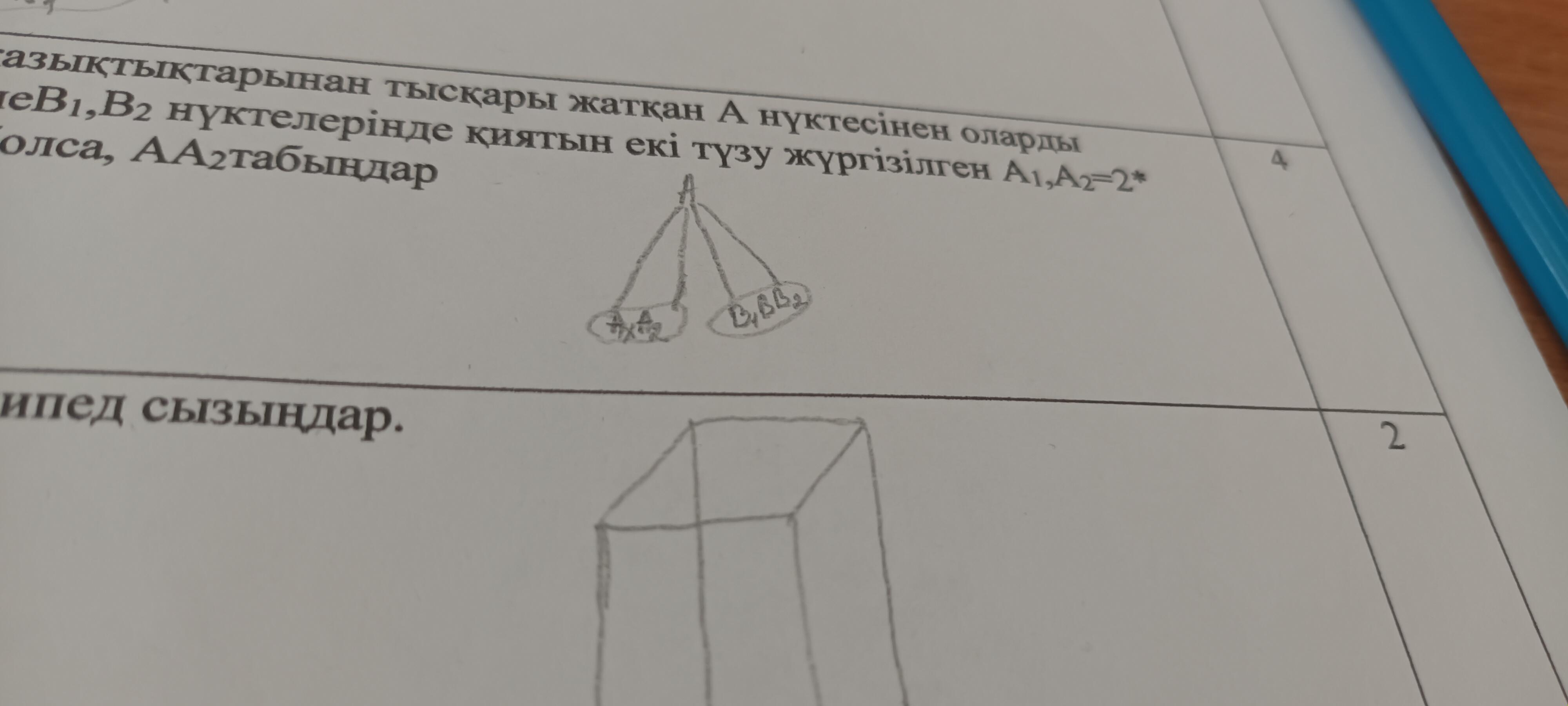 Параллель а мен b жазықтықтарынан тысқары жаткан А нүктесінен оларды сәйкесінше А1,А2 жәнеВ1,В2 нүктелерінде қиятын екі түзу жүргізілген A1,A2=2* A1A=12см,AB1=5см болса, АА2табындар