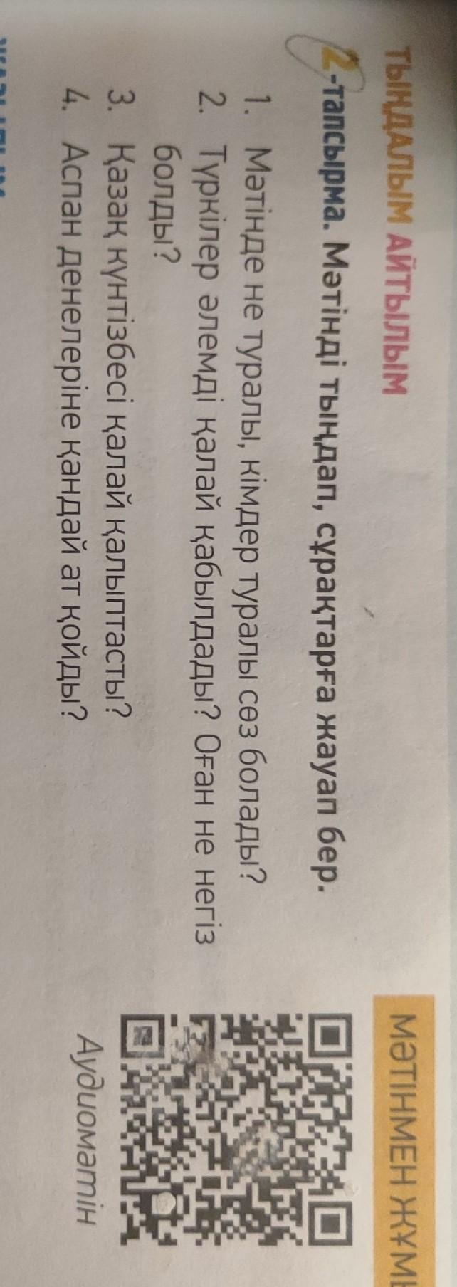 ТЫҢДАЛЫМ АЙТЫЛЫМ 2-тапсырма. Мәтінді тыңдап, сұрақтарға жауап бер. 1. Мәтiнде не туралы, кiмдер туралы сез болады? 2. Түркілер әлемді калай кабылдады? Оған не негiз болды? 3. Казак күнтізбесі калай калыптасты? 4. Аспан денелерiне кандай ат қойды? МӘТІНМЕН ЖҰМЫС Аудиоматин