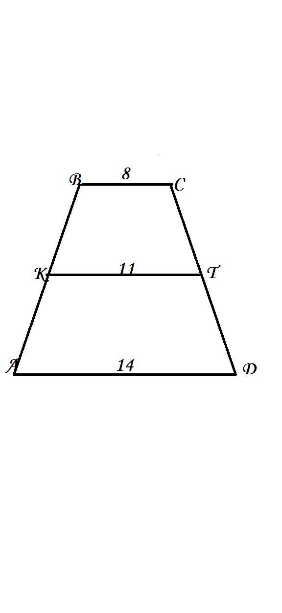 Средняя линия трапеции равна полусумме оснований. Пусть АD=х см, тогда КТ=(ВС+АD):2; 11=(8+х):2; 8+х=22; х=14; АD=14 см.
