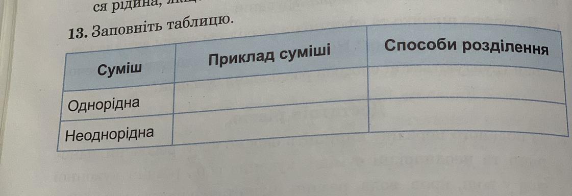 Однорідні суміші, прімери.Істінние розчини (кухонна сіль + вода, розчин спирту в воді) .Твёрдие розчини, сплави, наприклад, латунь, бронза.Газовие розчини (суміші будь-яких кількостей і будь-якого числа газів). Однорідні суміші, способи поділу. Дистиляція (вода-кухонна сіль), Кристалізація (вода-цукор), Випаровування (вода-кухонна сіль), Перегонка (нафта). Неоднорідні суміші, приклади. Суспензії (тверде + рідина), наприклад вода + пісок. Емульсії (рідина + рідина), наприклад вода + жир. Аерозолі (газ + рідина), наприклад туман. Неоднорідні суміші, способи поділу. Фільтрування (вода-пісок), Відстоювання (вода-крейда), центрифугування (вода-крейда), Магнітна сепарація (залізо-мідь)