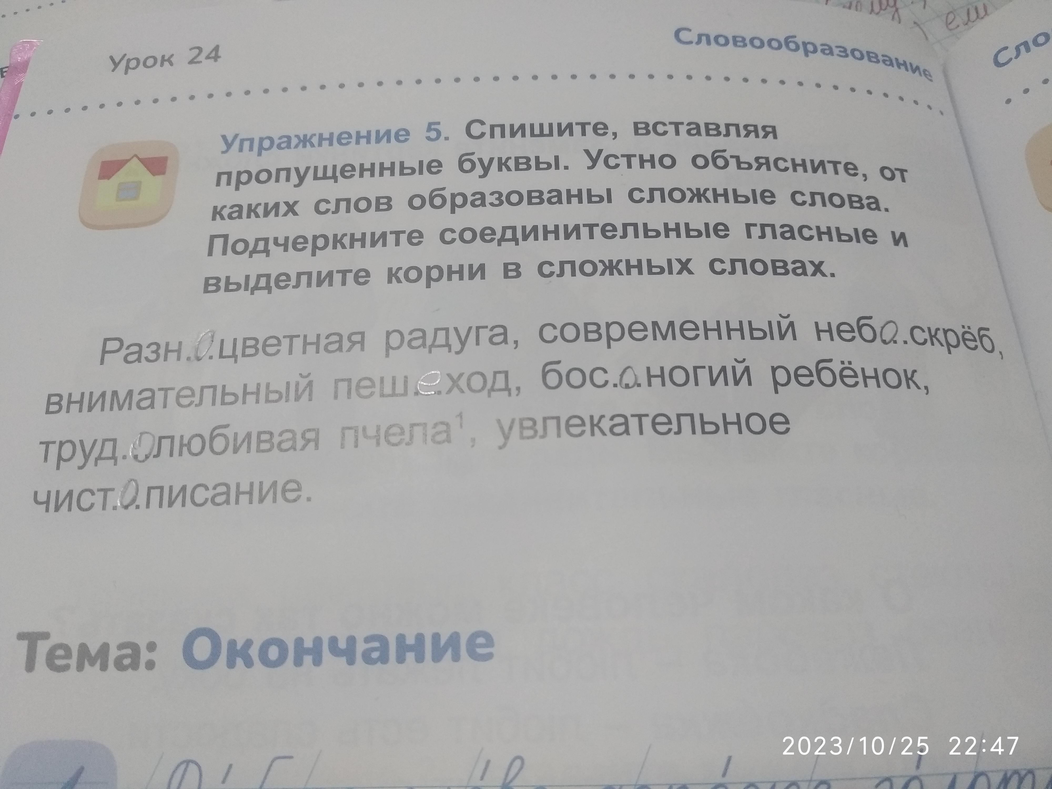 Спишите вставляя пропущенный буквы. Устно объясните от каких слов образованы сложные слова. Подчеркните соединительные гласные и выделите корни в сложных словах