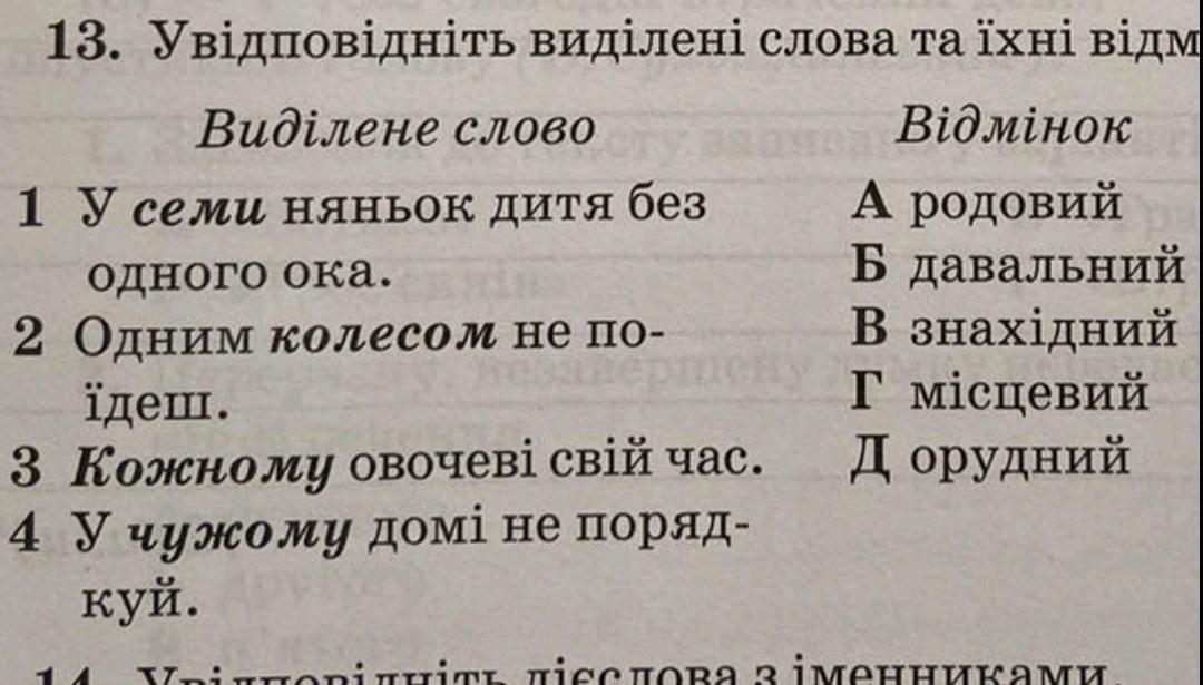 13. Увідповідніть виділені слова та їхні відм Виділене слово 1 У семи няньок дитя без одного ока. 2 Одним колесом не по- їдеш. Відмінок А родовий Б давальний В знахідний Г місцевий 3 Кожному овочеві свій час. Дорудний 4 У чужому домі не поряд- куй. дієслова з іменниками