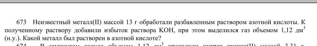 Неизвестный металл (11) массой 13 г обработали разбавленным раствором азотной кислоты. К полученному раствору добавили избыток раствора КОН, при этом выделился газ объемом 1,12 дм³ (н.у.). Какой металл был растворен в азотной кислоте?