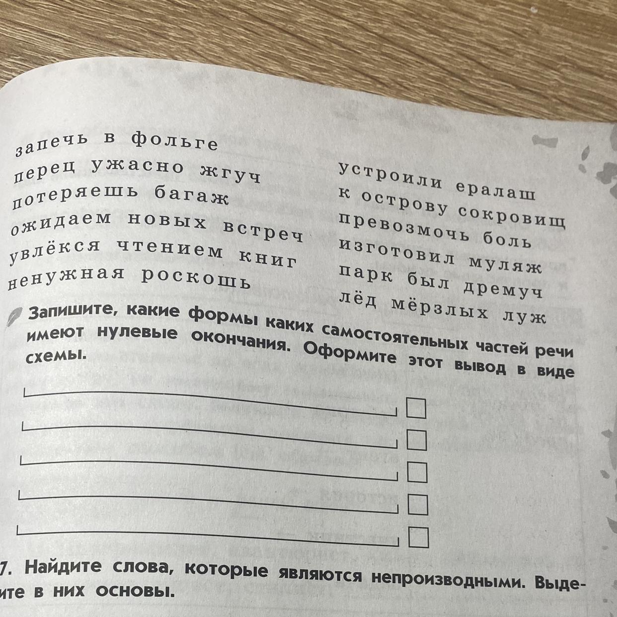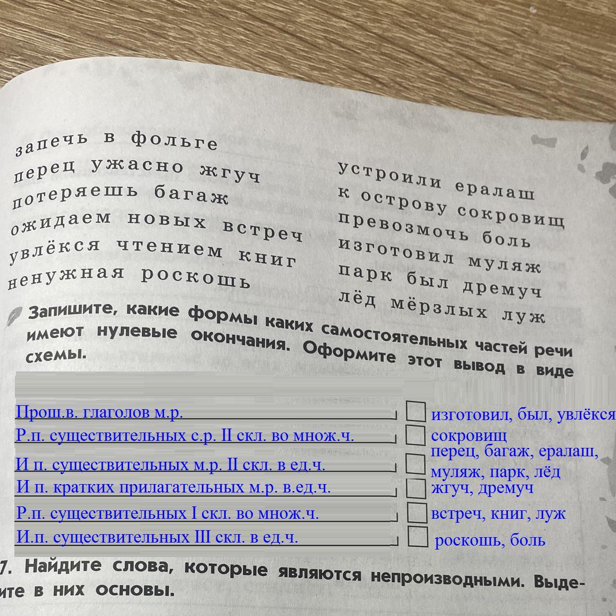 запечь в фольге, перец ужасно жгуч, устроили ералаш, потеряешь багаж, к острову сокровищ, превозмочь боль, ожидаем новых встреч, увлёкся чтеннем книг, изготовил муляж, парк был дремуч, ненужная роскошь, лёд мёрзлых луж. Запишите, какие формы каких самостоятельных частей речи имеют нулевые окончания. Оформите этот вывод в виде схемы?