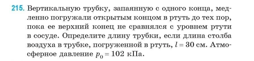 215. Вертикальную трубку, запаянную с одного конца, мед- ленно погружали открытым концом в ртуть до тех пор, пока ее верхний конец не сравнялся с уровнем ртути в сосуде. Определите длину трубки, если длина столба воздуха в трубке, погруженной в ртуть, 1 = 30 см. Атмосферное давление р = 102 кПа. ро
