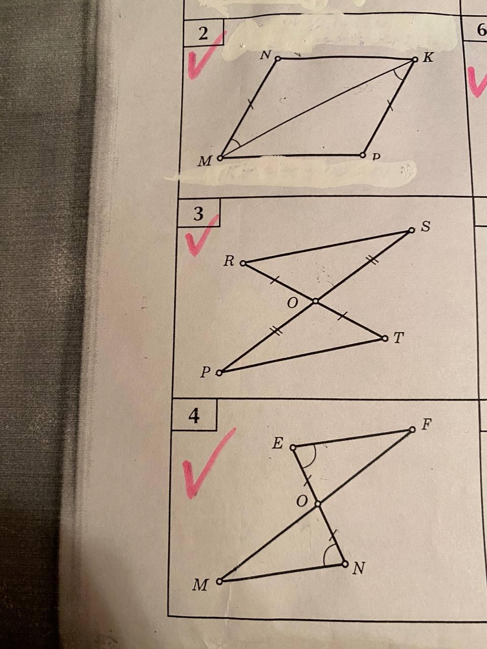 4. OEF=ONM, второй признак равенства треугольников. угол О (вертикальный), OE=ON (по рисунку) и угол Е= углу N (внутренние разносторонние углы при пересечении двох паралельных прямых)